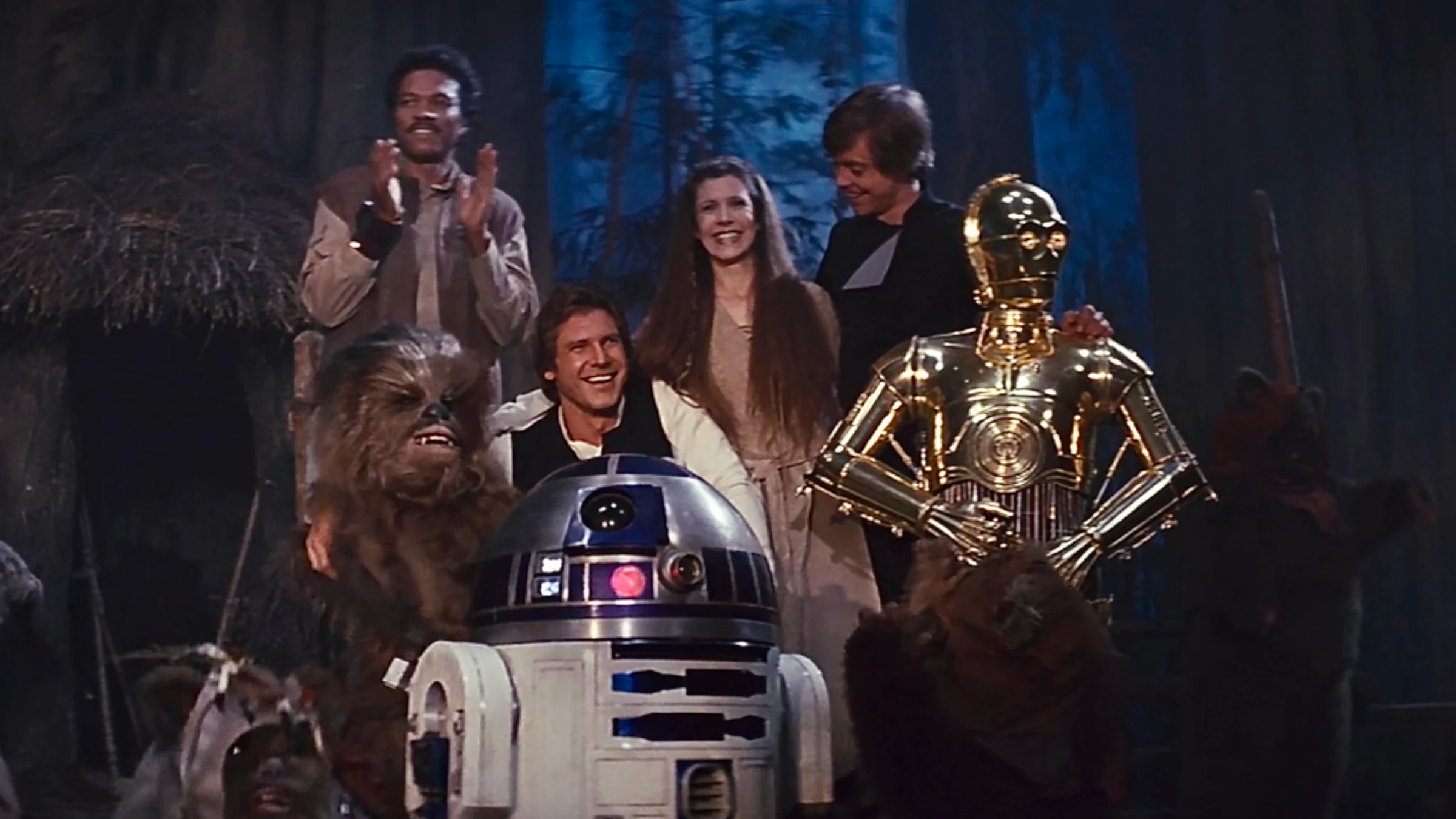 Basterebbe solo questo a fare del Ritorno dello Jedi il grande film che è. Ma c’è persino di più: l’attacco alla seconda Morte Nera, forse la miglior battaglia spaziale di tutti i tempi; la triste morte di Yoda, che i fan avevano conosciuto solo tre anni prima; Jabba the Hutt, un nome quasi mitico che dopo ben due film finalmente entra in scena… per uscirne poco dopo per mano di Leia, non prima di essere entrato nell’immaginario collettivo come uno dei gangster più disgustosi, putrescenti e verminosi; la sfortunata, diciamo così, morte di Boba Fett (sarebbe malauguratamente “resuscitato” solo molti anni più tardi, ma sorvoliamo…); Bib Fortuna, squallido lacchè dalle strane fattezze; Salacious Crumb, insopportabile mostriciattolo dalla risata sadica; Mon Mothma, la carismatica, elegante e compassionevole leader della Ribellione; Nien Nunb, il copilota di Lando Calrissian dalla risata buffa e contagiosa; lo stesso Lando Calrissian, generale e Capo Oro ai comandi del Millennium Falcon nell’attacco alla seconda Morte Nera; l’ammiraglio Ackbar, che entrò subito nel cuore di tutti con la battuta «È una trappola», oggi meme replicato all’infinito; l’imperatore, che finalmente è un personaggio a tutto tondo, non un semplice nome o un ologramma; il ritorno del fantasma di Forza di Obi-Wan, che pronuncia la celebre battuta: «da un certo punto di vista» e rivela a Luke l’esistenza della sua sorella gemella… Leia; infine, gli Ewok.